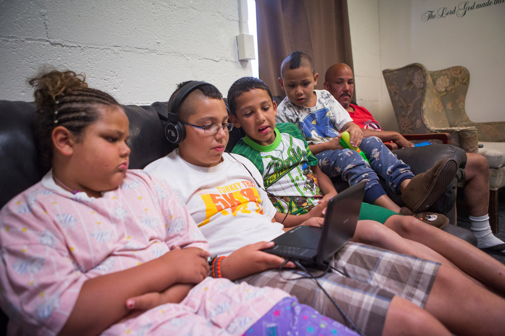 John Nettles, right, looks on as his children watch a show together on a portable DVD player in the play room at The Valley Mission on Aug. 8, 2015. “I wanted to try and make my kids feel at home,” said Nettles, describing how he brought a TV into the shelter but had to take it out of their room due to one of the organization’s policies. “There’s a lot of things that you can’t have, but I still try anyway.”