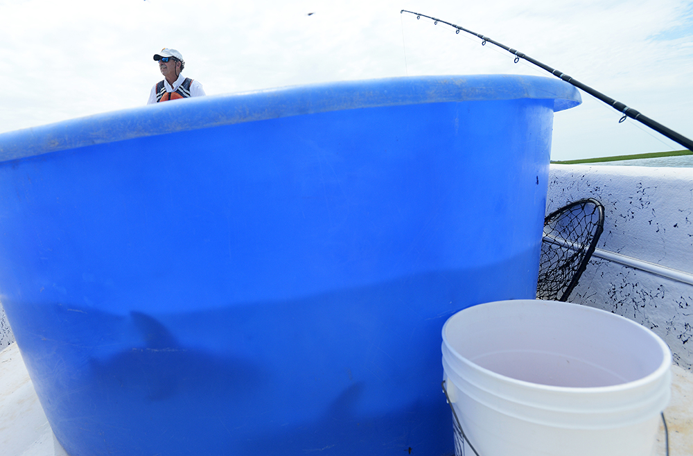 A pair of juvenile sandbar sharks, bottom, swim in a temporary holding tank on a boat near Parramore Island on Thursday, July 9, 2015 while Rich Brill looks over the water. Virginia Institute of Marine Science Eastern Shore Laboratory is conducting experiments on the segments of the sharks’ circulatory system. A team of four left the lab on Thursday morning to catch several sharks for experimental purposes.