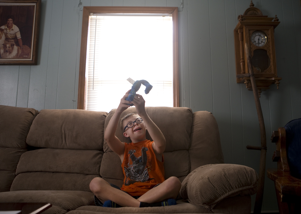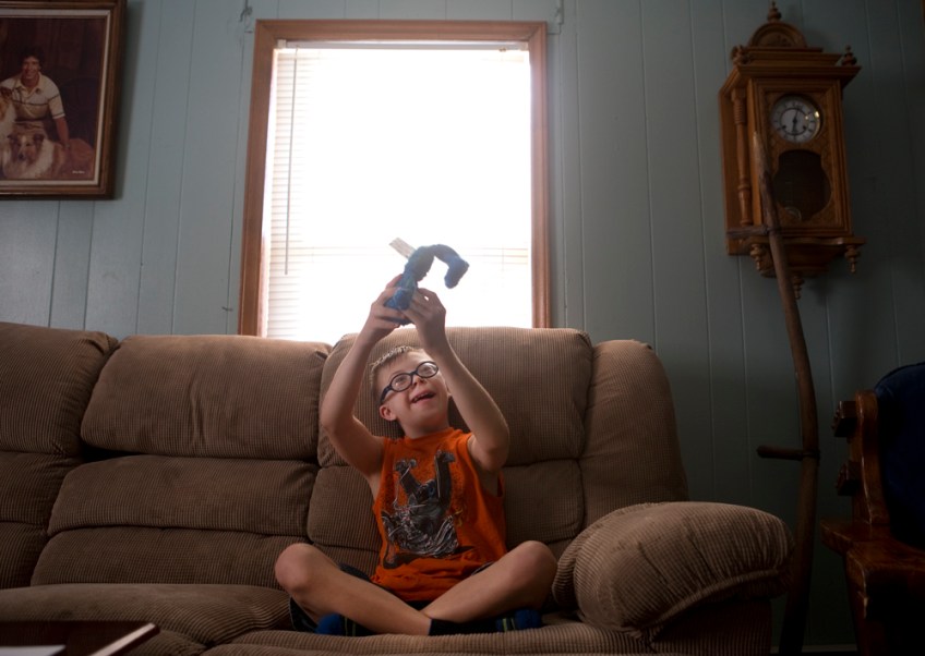 Devin Bailey, 9, plays with a toy Elmo doll while sitting on a couch at his father’s home in Troutville Wednesday evening, Aug. 12, 2015. Devin cannot communicate basic information like his name, age or address and cannot count to ten, says his father Jimmy. Bailey has autism and Down Syndrome and attended Troutville Elementary School.