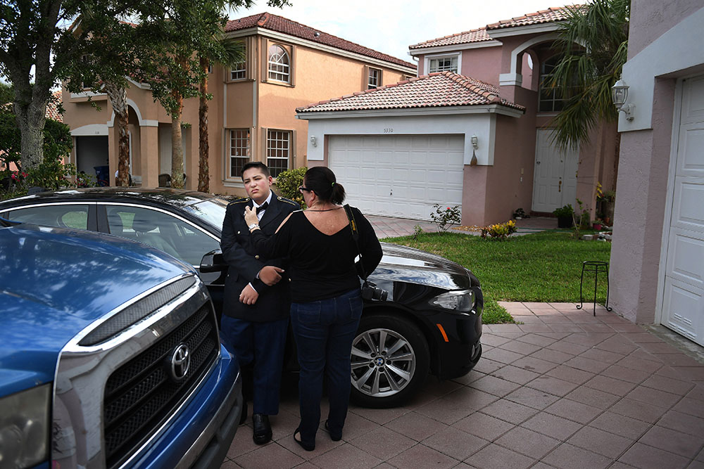Kyle Laman, 15, has his bow tie adjusted by his mother, Marie Laman outside the family’s home before Kyle attended a JROTC military ball on Saturday April 21, 2018 in Coral Springs, FL. His parents had to coax him out of the house to attend the event. Kyle was shot in during a deadly mass shooting at Marjory Stoneman Douglas High School on February 14, 2018.