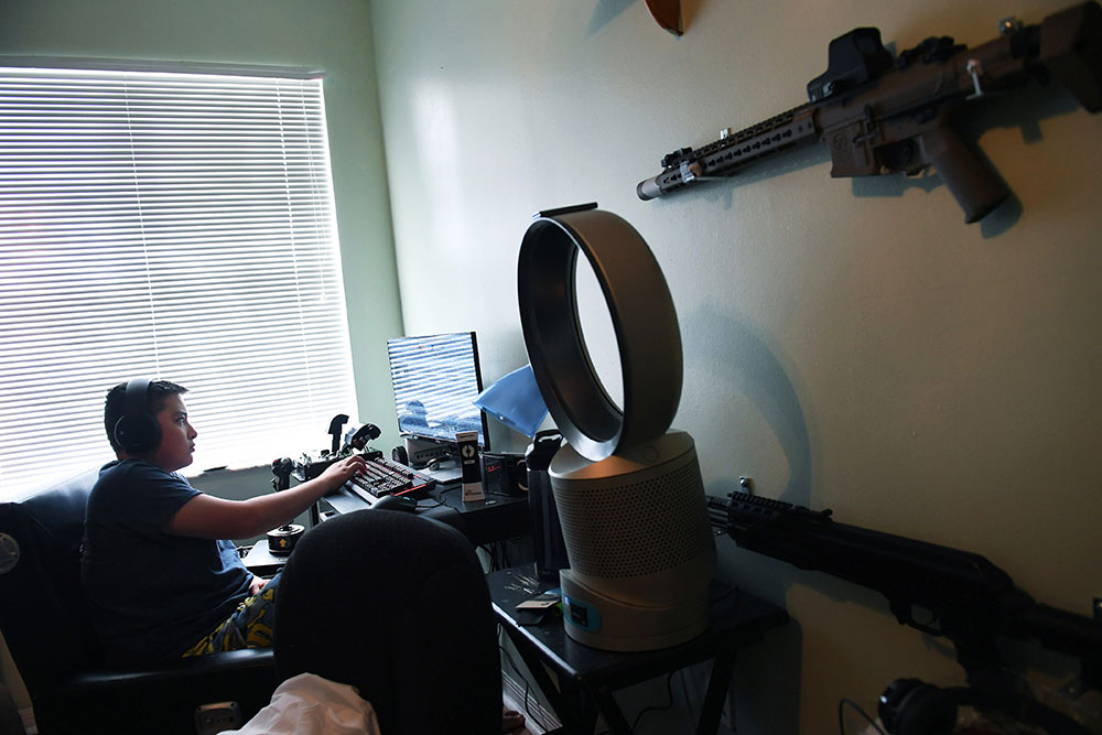 ParklandRecovery Published January 4, 2019 at 1000 × 667 in ParklandRecovery Kyle Laman, 15, plays a video game in his room at his family’s home on Sunday April 22, 2018 in Coral Springs, FL. Laman was shot during a mass shooting at Marjory Stoneman Douglas High School. Airsoft rifles are seen on his wall at right.