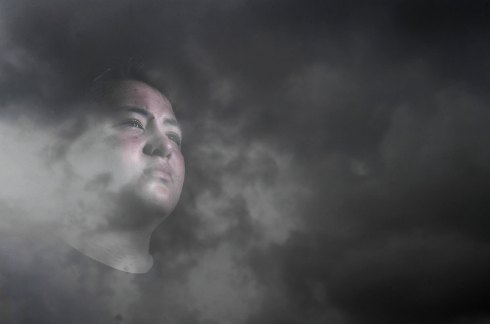 Kyle Laman, 15, poses for a portrait at his family’s home on Saturday May 26, 2018 in Coral Springs, FL. Laman was shot near his right foot during a mass shooting at Marjory Stoneman Douglas High School. He is photographed through a sliding glass door which is reflecting a stormy sky.