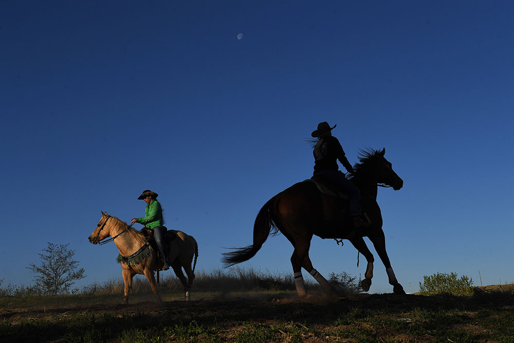 Lauren Unerwood, left, of Meeker, OK and Ilyssa Glass, right, of Tatum, NM warm up their horses before competing in barrel racing during Pioneer Days on Friday May 04, 2018 in Guymon, OK. This was the 86th year of the event.