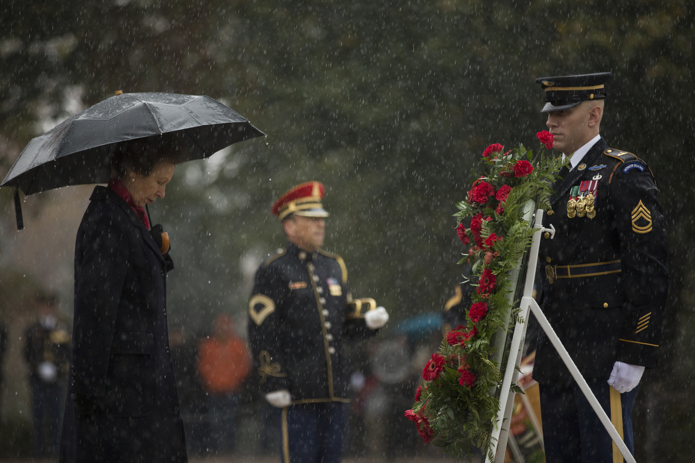 Princess Anne, daughter of Britain’s Queen Elizabeth II and the Duke of Edinburgh, places a wreath at the Tomb of the Unknowns at Arlington National Cemetery in Arlington, Va., on Thursday, November 6, 2014. Princess Anne also unveiled a plaque honoring 5 Americans with the Victoria Cross for service in World War I.