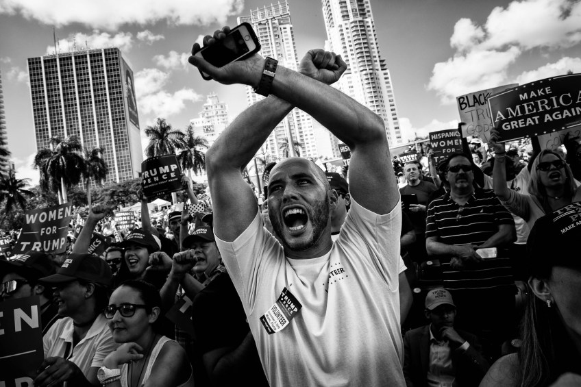 HM: Election: M. Scott Mahaskey, Politico–A campaign volunteer yells “lock her up” as Donald J. Trump holds a campaign rally Nov. 2, 2016 at the Bayfront Park Amphitheater in Miami, Florida. The phrase became a rally cry across the United States as Trump supporters believed former Sec. of State Hillary Clinton should be charged over various actions during her time as secretary.